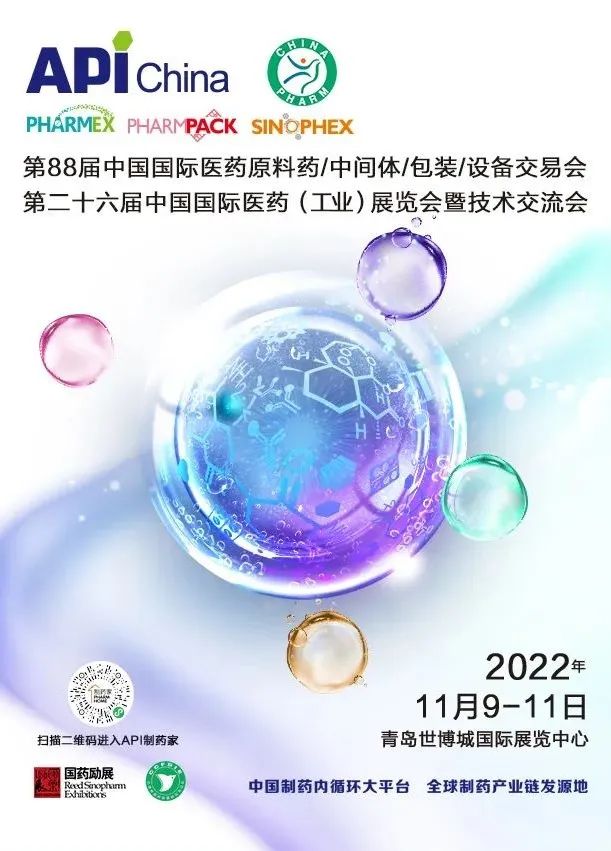 第88屆中國國際醫(yī)藥原料藥/中間體/包裝/設(shè)備交易會(huì)(API China)和第二十六屆中國國際醫(yī)藥(工業(yè))展覽會(huì)暨技術(shù)交流會(huì)(CHINA-PHARM)將于2022年11月9日-11日,在青島世博城國際展覽中心舉辦。